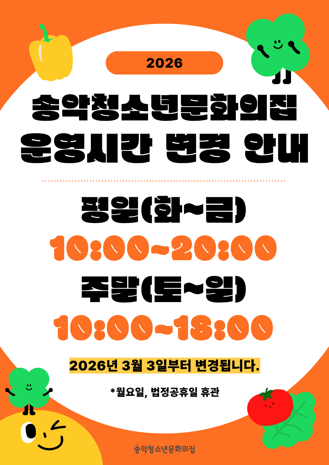 2026년 송악청소년문화의집 상반기 토.토.로(토요일 토요일은 송악으로) 프로그램 참가자 모집송악청소년문화의집에서 상반기 토.토.로 프로그램의 참가자를 모집합니다!재미있고 알찬 과정을 준비하였으니 청소년 및 보호자 분들의 많은 관심과 참여 부탁드립니다!▶ 신청기간 : 2026. 3. 12.(목) 10시 ~ ...